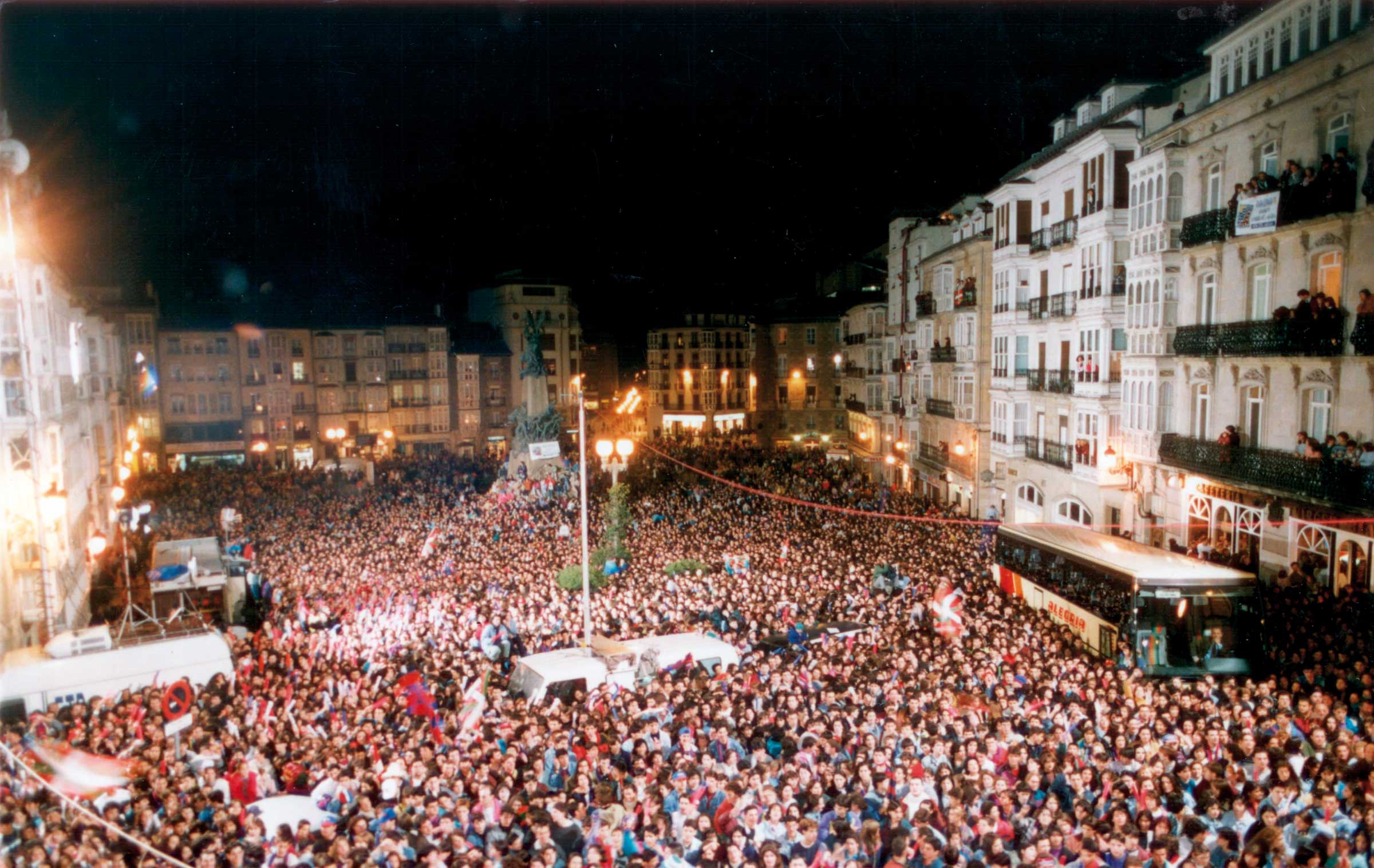 En la noche del lunes 6 de marzo, la plaza de la Virgen Blanca volvió a llenarse para homenajear a la campeones de Copa, cerca de 35.000 personas rindieron pleitesía a unos jugadores que celebraron un trofeo en total sintonía con la ciudad de Vitoria.