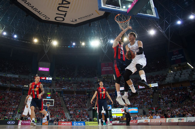 Dos claves se repetían antes del encuentro. El estado físico de Voigtmann, cuya lesión fue el inicio del fin baskonista en el segundo, y el rendimiento de un Doncic algo apagado en este Playoff Final. Con el primero en pista, el decisivo fue el segundo. El aviso llegó pronto, cuando encadenó 5 puntos consecutivos previos al triple a tabla de Rudy para adelantarse en el marcador (28-30, m.16).