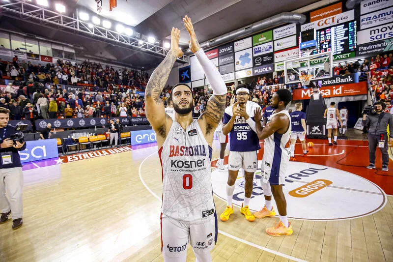 Foto: acb Photo / Joaquim Alberch. Celebración de la victoria del Baskonia en Manresa en el partido 1600 del club en la Liga ACB (29/12/24)