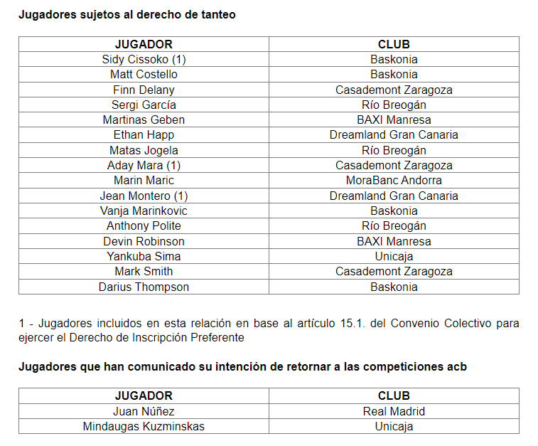 Consulta la lista de jugadores sujetos a derecho de tanteo y aquellos que han comunicado su intención de regresar a las competiciones ACB.