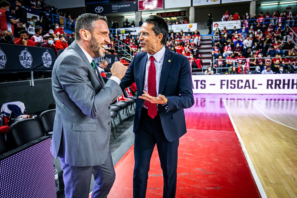 Foto: championsleague.basketball. Pedro Martínez bromea con Ibon Navarro antes de las semifinales de la Basketball Champions League en Manresa.