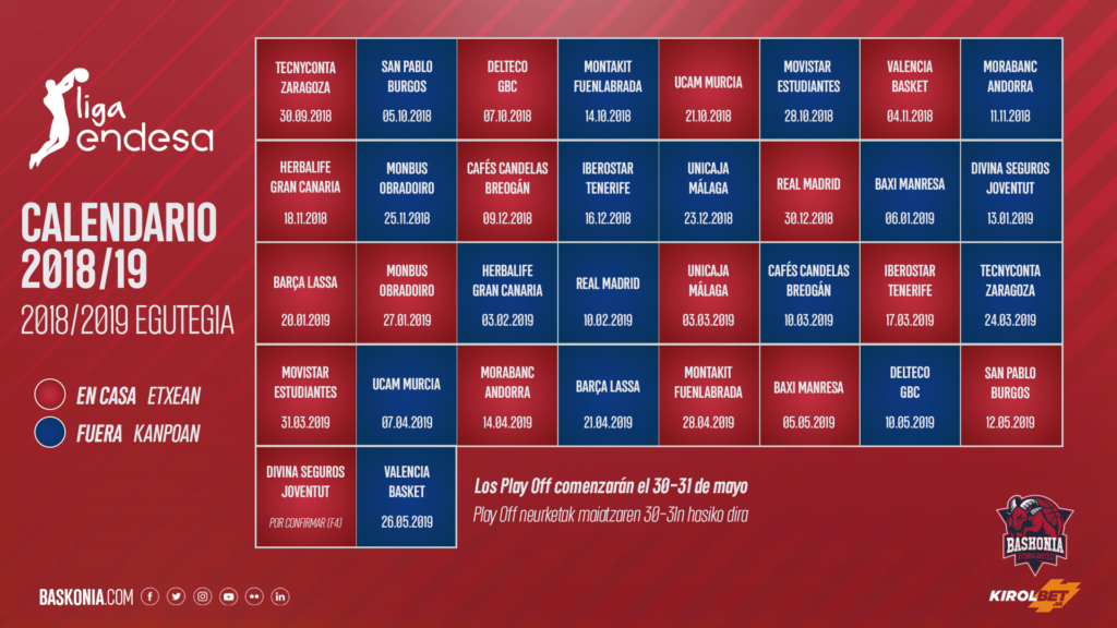 El primer partido como visitante para el conjunto baskonista será en la jornada 2, entre semana, el 4 o 5 de octubre ante el San Pablo Burgos, y la vuelta en Vitoria-Gasteiz, el 11 o 12 de mayo de 2019, en el cual seguro que se podrá disfrutar de un ambiente increíble como la pasada temporada en el fin de semana previo a la Final Four de la Euroleague que se celebrará en el Buesa Arena.