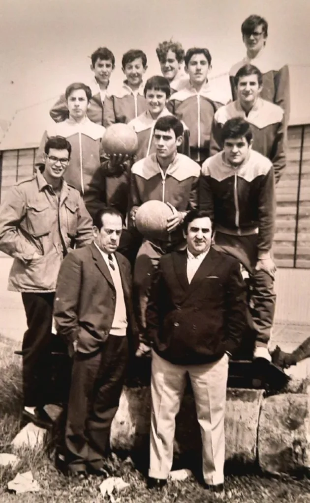 Foto: Xabier Añua y sus jugadores que se proclamaron campeones de España de Minibasket en 1968 posan delante del pabellón de Mendizorroza.