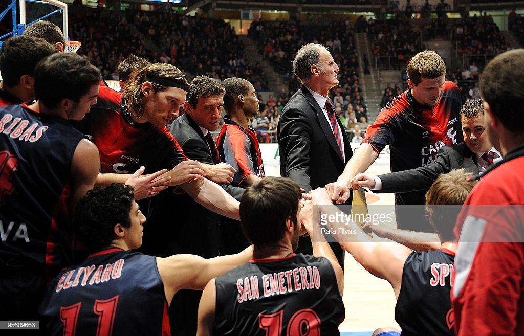 Foto:Rivas/EB via Getty Images.Dusko Ivanovic y sus jugadores en un tiempo muerto ante Maroussi