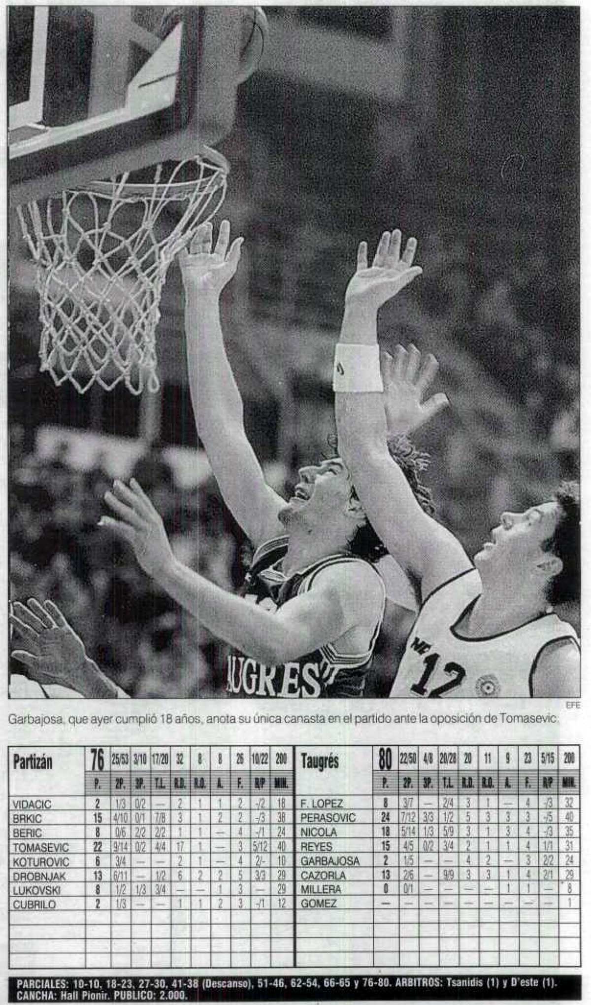 En otra histórica cancha como la del Partizan de Belgrado tuvo lugar el debut con tan solo 17 años de Jorge Garbajosa, ante la dupla interior serbia ya de campanillas formada por Tomasevic y Drobnjak. Y exteriores como Brkic, Cubrillo o Koturovic.