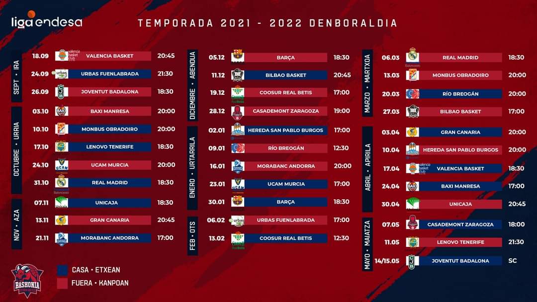 El domingo 31 de octubre llegará a Vitoria-Gasteiz el Real Madrid de Pablo Laso en el partido correspondiente a la octava jornada. En la última jornada de 2021, el Baskonia se desplazará a Zaragoza como viene siendo habitual en las últimas temporadas por esas fechas. 2022 arrancará con la visita de San Pablo Burgos al recinto de Zurbano.