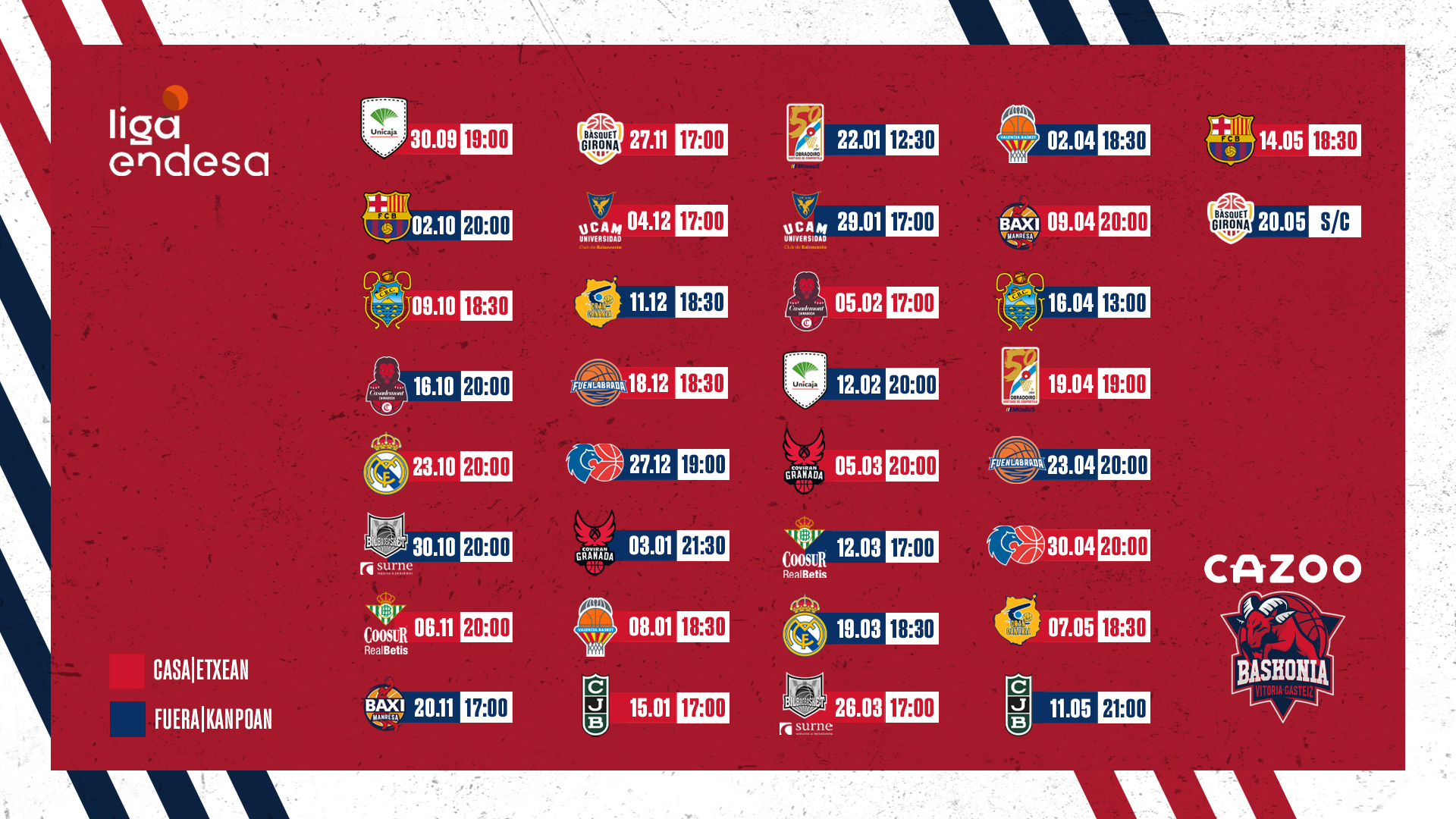 El domingo 23 de octubre a las 20:00h el vigente campeón de la acb, el Real Madrid, visitará Vitoria-Gasteiz. Un fin de semana más tarde los de Peñarroya visitarán Miribilla en el que será el primer derbi de la temporada. Durante las navidades, Cazoo Baskonia visitará Lugo y Granada para cerrar el día 8 de enero con un duelo en Zurbano ante Valencia Basket. La primera vuelta el combinado gasteiztarra la cerrará el día 22 de enero visitando a Monbus Obradoiro.