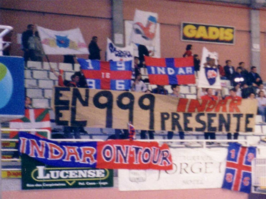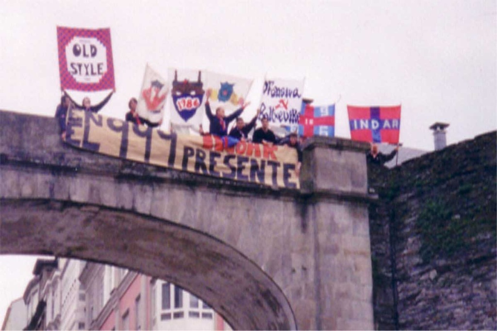 Después de esto cogimos las pancartas , estandartes… etc y nos fuimos acercando al pabellón, pero antes sacamos unas fotos en la muralla con una pancarta hecha para la ocasión “EN EL 999 INDAR PRESENTE” para entonces ya nos habíamos juntado con los 3 clásicos de Ourense que suelen acompañarnos en nuestras excursiones por tierras galegas.