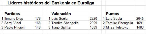 Los líderes históricos del Baskonia en la Euroliga desde la temporada 2000/01 y 500 partidos después hasta hoy.