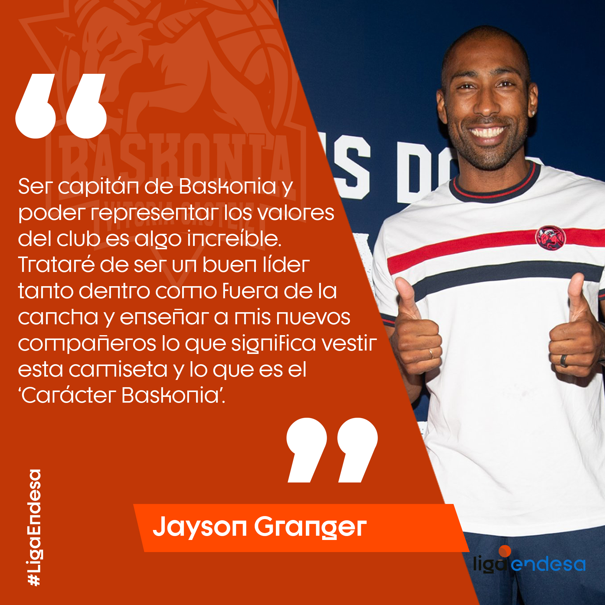 Jayson Granger será el nuevo capitán del Baskonia en la segunda etapa del base uruguayo en Vitoria-Gasteiz. Para Granger: “Ser capitán de Baskonia y poder representar los valores del club es algo increíble. Trataré de ser un buen líder tanto dentro como fuera de la cancha”, señaló el charrúa, que además remarcó que quiere “enseñar a mis compañeros lo que significa vestir esta camiseta y lo que es el ‘Carácter Baskonia’”.