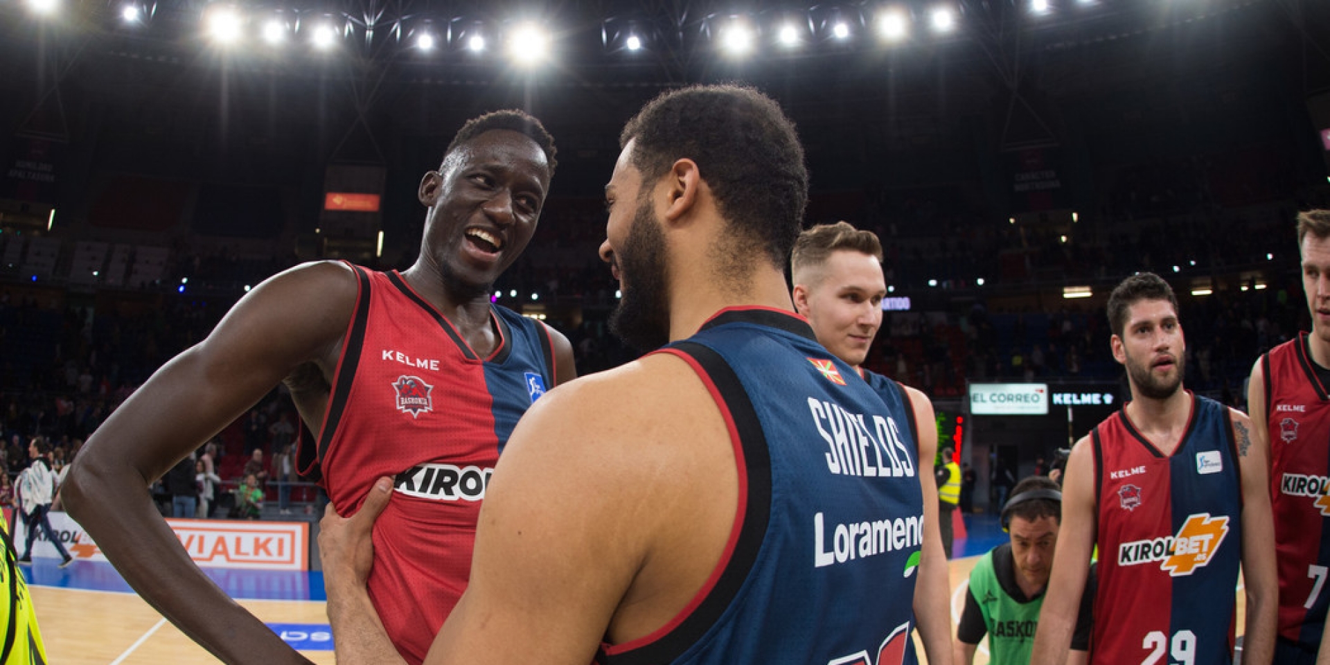 Foto:ACBPhoto/Aitor Bouzo. Diop y Shields celebran una victoria junto al resto del equipo