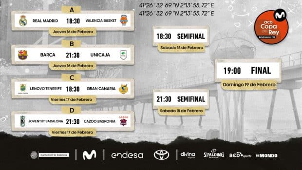 La Copa de Badalona arrancará las 18:30 h del jueves 16 de febrero con el enfrentamiento, entre el líder, Real Madrid y Valencia Basket. Tres horas más tarde, será turno del duelo que protagonizarán F.C Barcelona y Unicaja de Málaga.