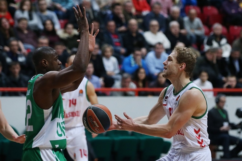 Foto:euroleague.net Jaka Blazic pasa el balón ante Latavious Williams