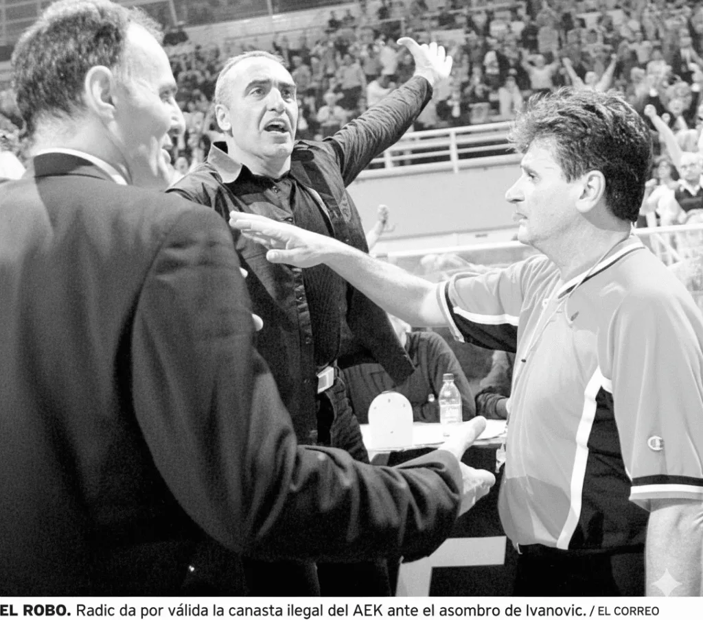 Foto: El Correo. Dusko Ivanovic ante el colegiado Danko Radic que dio por buena la canasta de Dikoudis del AEK en el primer partido de la semifinales de Euroliga en 2001