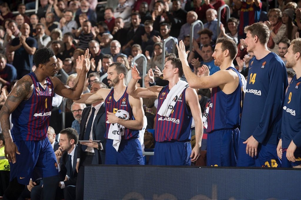 Foto:euroleague.net Los jugadores del banquillo del FC Barcelona saludan a Kevin Serpahin