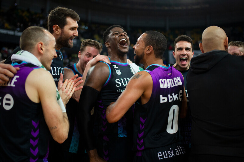 Foto: acb Photo / A. Arrizabalaga. Celebración de los jugadores de Bilbao Basket tras ganar Baxi Manresa