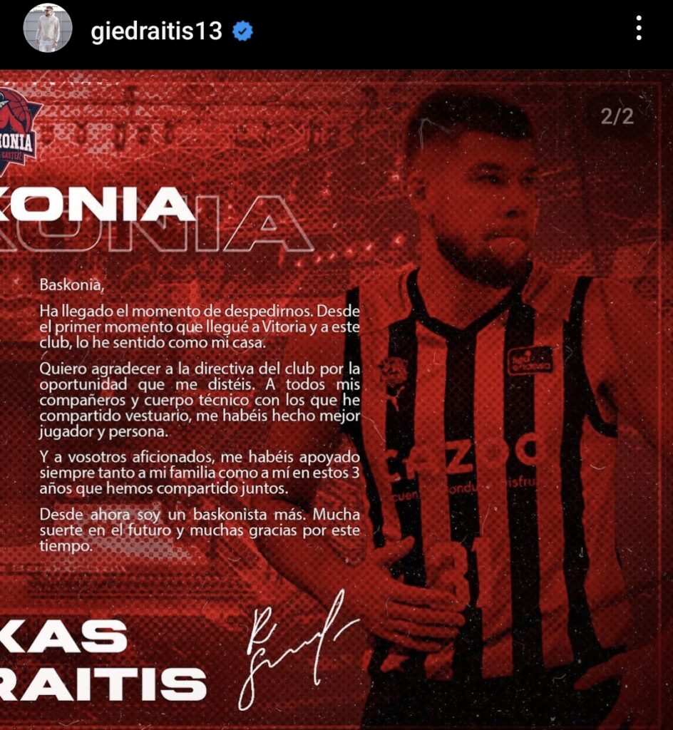 El alero lituano no seguirá en el Baskonia tras tres temporada vinculado al club azulgrana, expirado su contrato el pasado 30 de junio, Giedraitis continuará su carrera deportiva lejos de Vitoria-Gasteiz. Su próximo destino será Belgrado, militará en el Estrella Roja de Dusko Ivanovic.