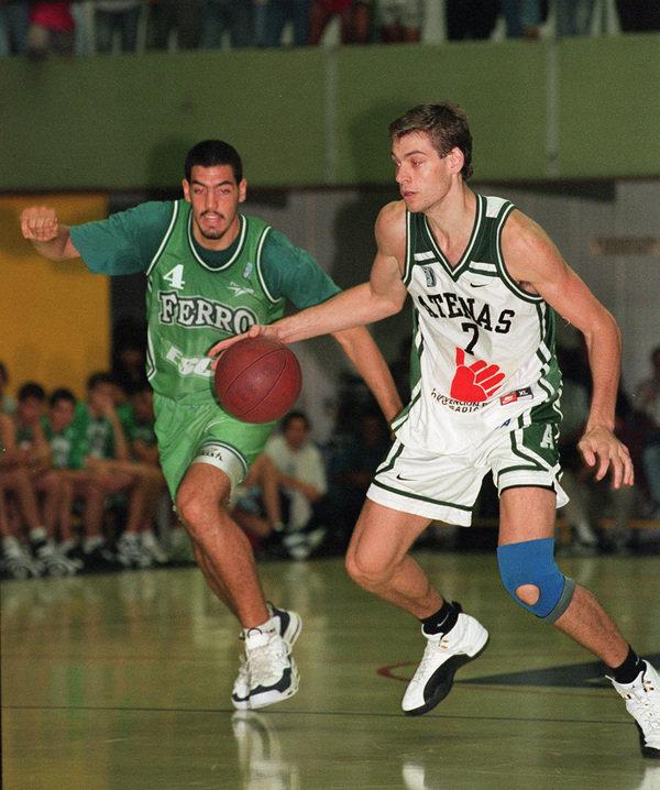 Foto: @mfigueras70. Scola (Ferro) y Oberto (Atenas de Córdoba) en la Liga Argentina en 1996