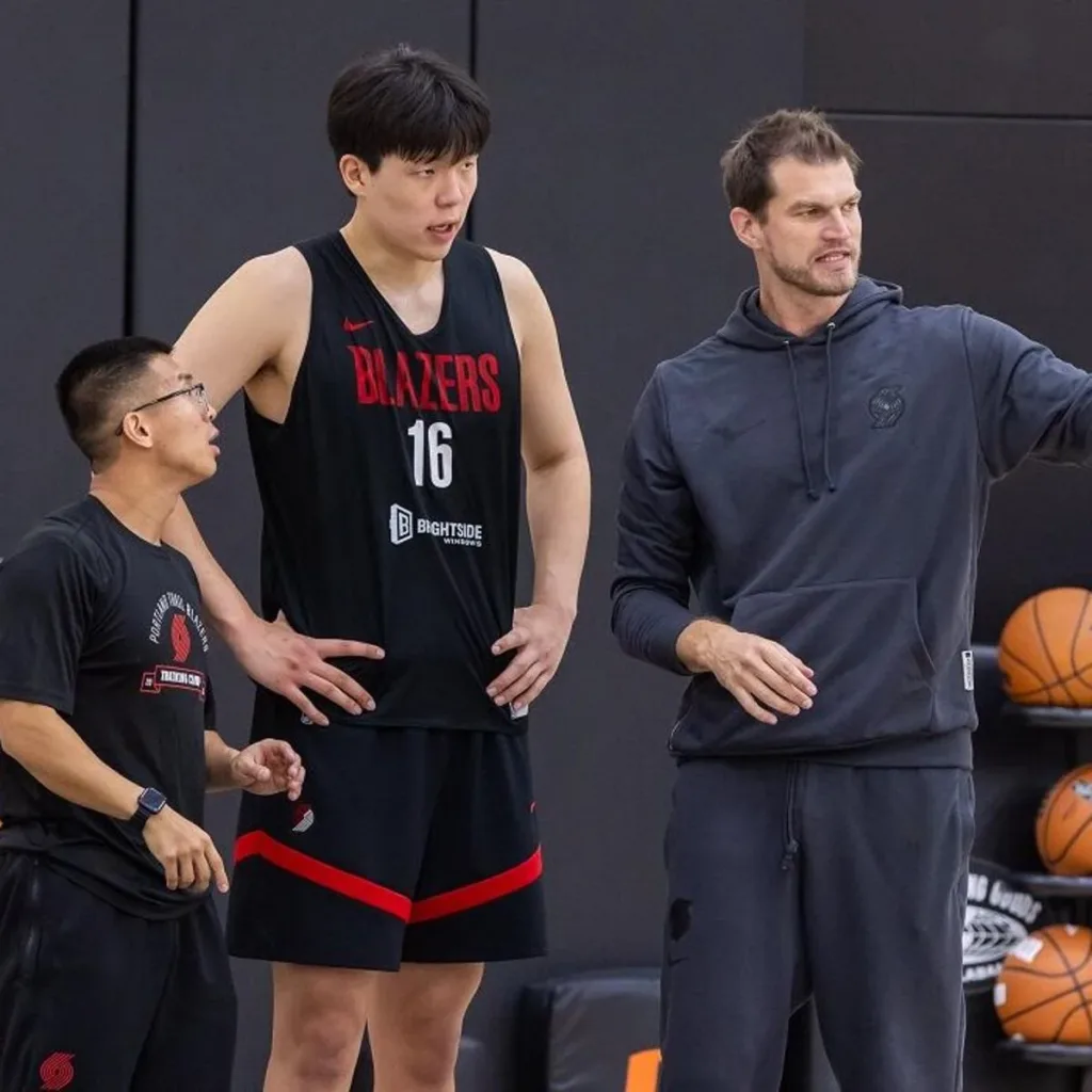 Foto: Tiago Splitter alecciona al joven rookie chino Yang Hansen de Portland Trail Blazers.